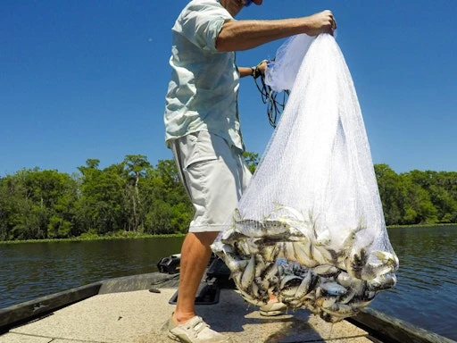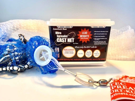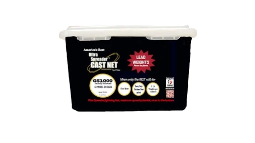 GS 1000 Series Cast Net Created for guides and the serious cast net user, The GS-1000 Ultra Spreader™ Cast Nets are designed to generate their actual maximum spread potential. The exclusive Fitec process correctly balances the net panels with the proper length of the lead line, in turn allowing you to catch more bait. Cast net users will be more successful than ever catching bait with our panel nets. This net uses a 1 lb. per radius foot weight system in order to sink faster and catch more bait.