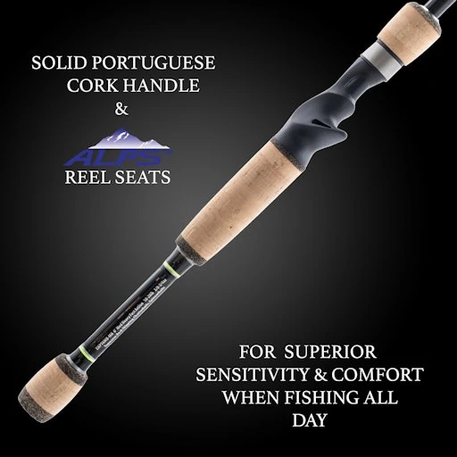 The blank-through reel seats offer finger-to-blank contact for unparalleled sensitivity and offer incredible ergonomics and palm-able comfort, while further reducing weight as well. Premium Portuguese cork grips and Alps guides balance out each rod perfectly.
