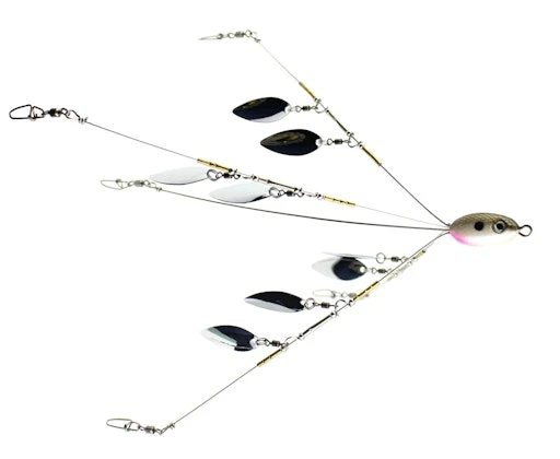 The J-pod Spin Flash Umbrella Rig features a high definition lightweight head with brilliant paint and 5 light gauge/high strength wires and 8 solid brass polished chrome blades with high quality swivels and snaps. Try these with a Jenko Booty Shaker for amazing results!