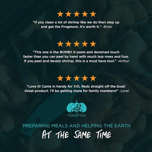 Introducing the Frogmore Shrimp cleaner. This first-of-its-kind shrimp tool allows you to peel, devein, and butterfly shrimp in one single smooth motion. Elegantly designed and easy to use, it gives you a perfect shrimp every time.