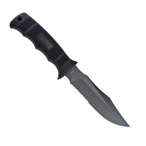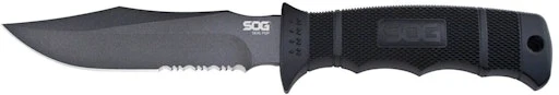 The SEAL Pup has a partially serrated AUS-8 blade powder coated for low-reflection and corrosion resistance. Its lightweight, glass-reinforced nylon handle features a raised diamond pattern for secure gripping. Part M37N-CP”