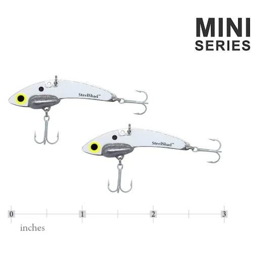 The SteelShad® Mini 1/4 oz. blade bait in our White Shad pattern is 1 3/4 inches long, made from durable stainless steel with a molded lead weight, and feature two #12 VMC Permasteel hooks that are coated for both fresh and salt water fishing.